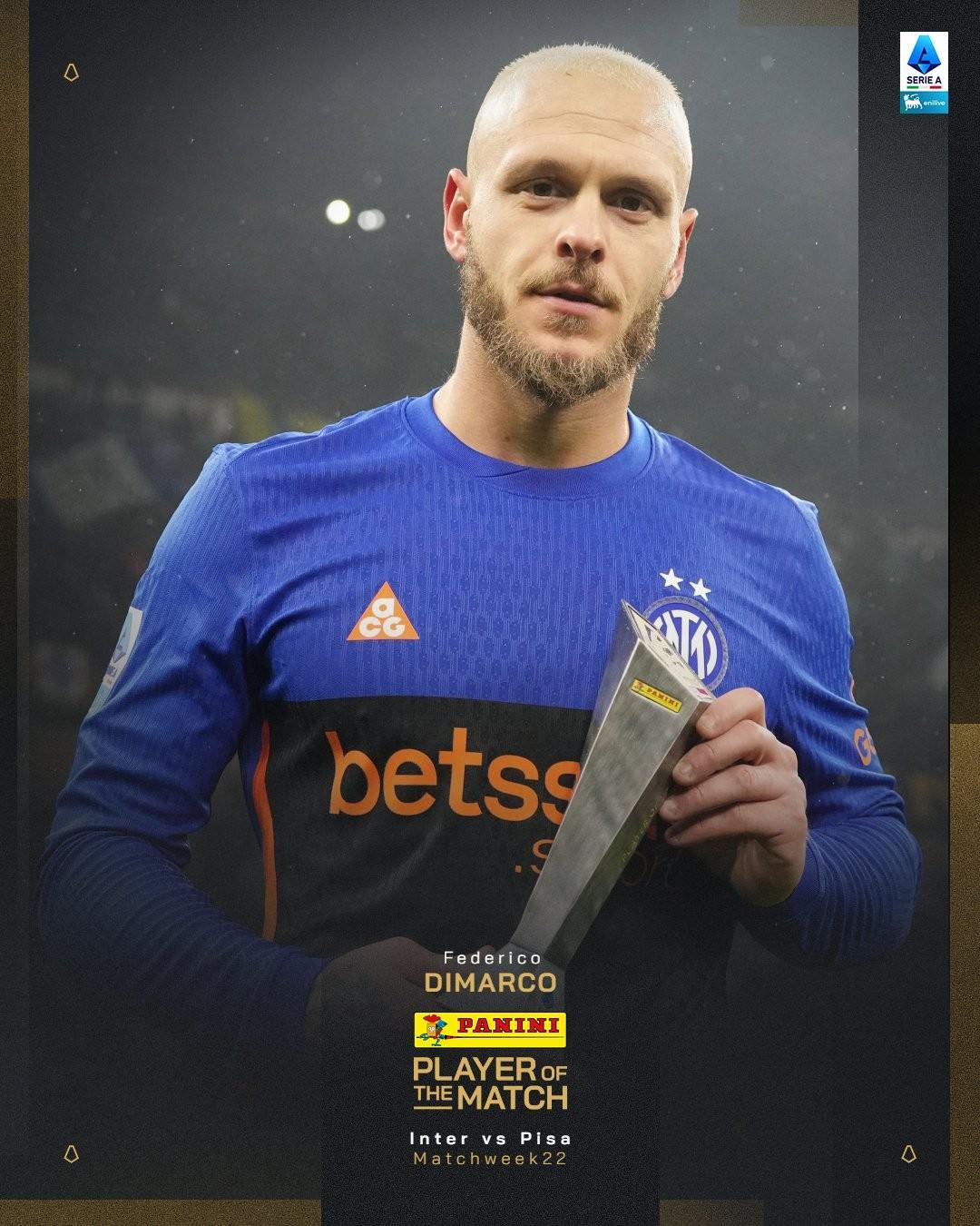 官方消息,迪马尔科当选国际米兰对阵比萨一役全场最佳。