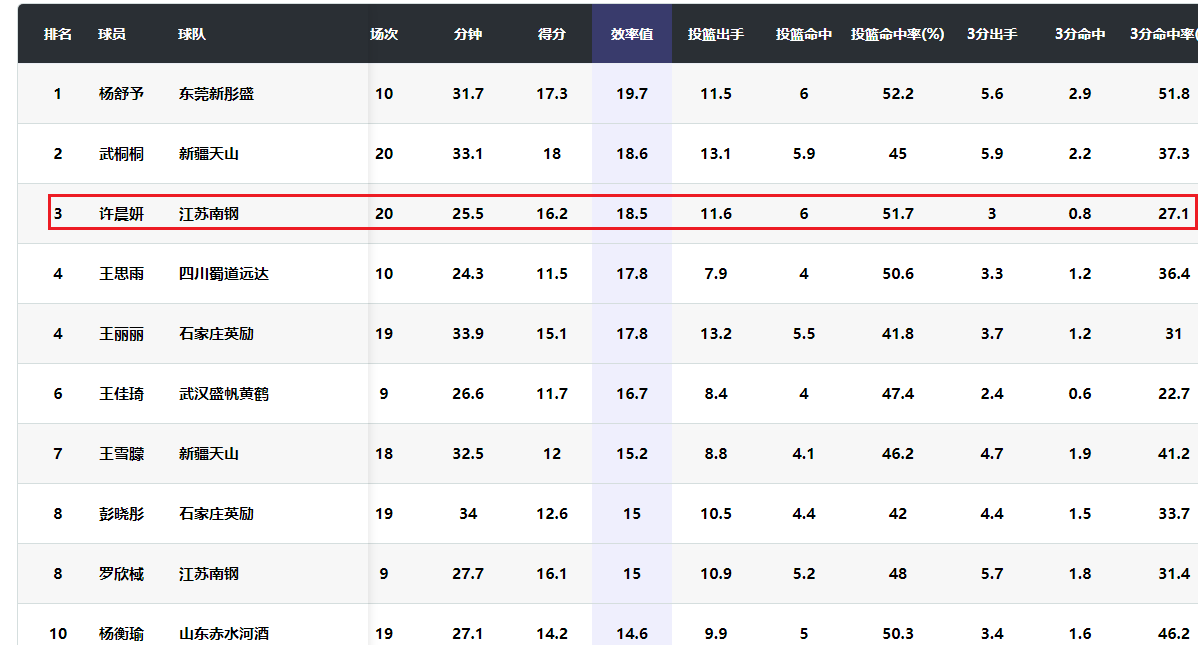 许晨妍最近两年都是WCBA联赛表现最好的内线球员之一。可惜她在2025年没有被宫鲁鸣征召进中国女篮。许晨妍上赛季场均得到15.0分7.7篮板1.7助攻,效率值18.5。